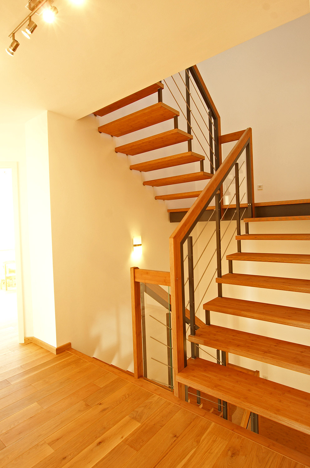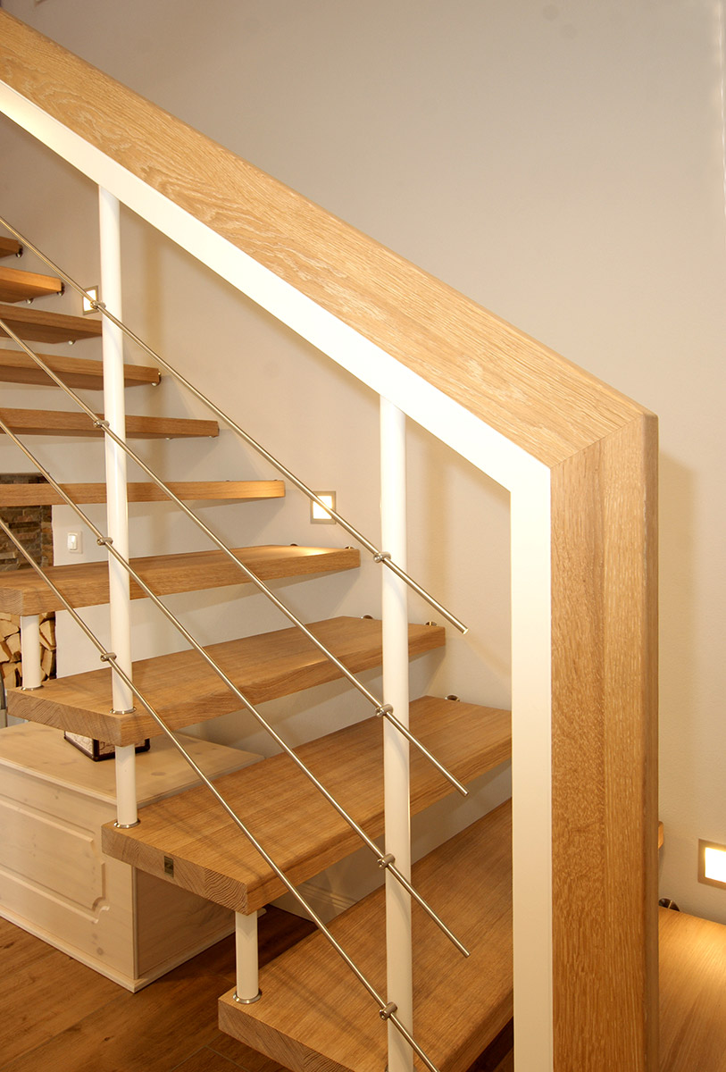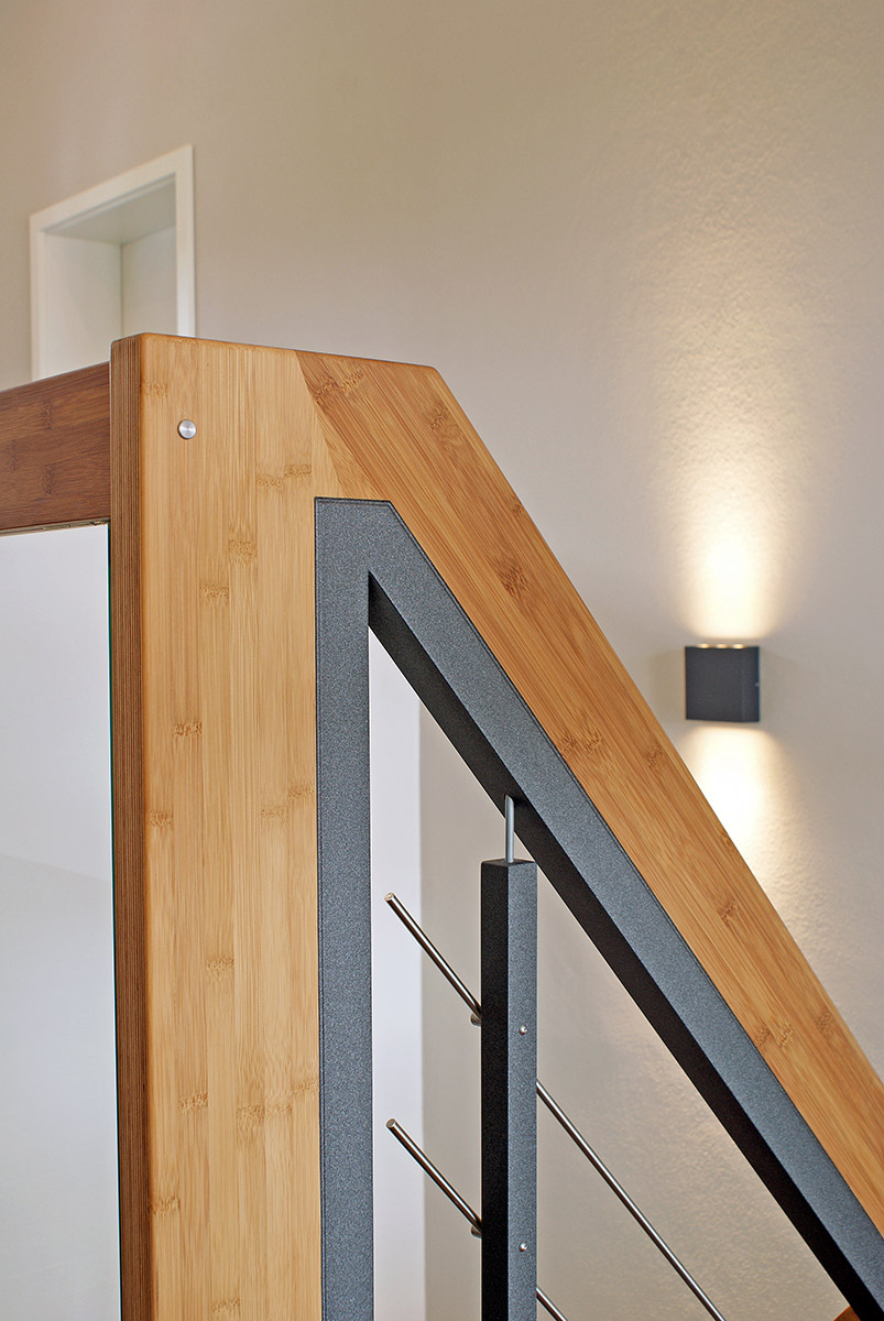 Der Handlauf Ihrer Treppe wird mit einem Quarzitrahmen unterstrichen. Eine feine Kannelierung trennt Holzstruktur und Rahmen. Geschick und Präzision zeigen meisterliche Handwerkskunst. Der schimmernde Metalllook setzt feine Akzente in Ihrem Zuhause. Zeitlos und doch modern wird Ihre Treppe zum Blickfang.