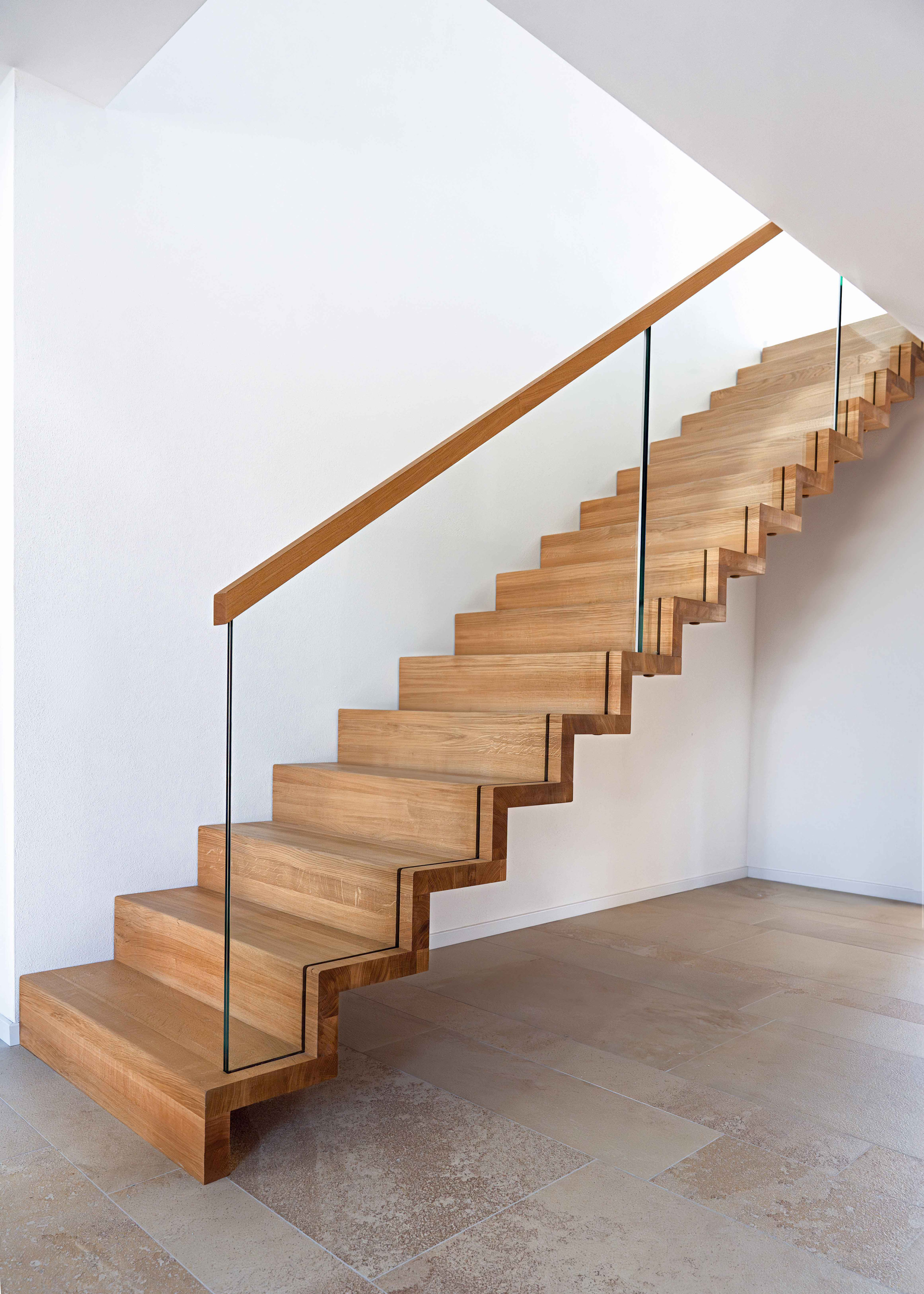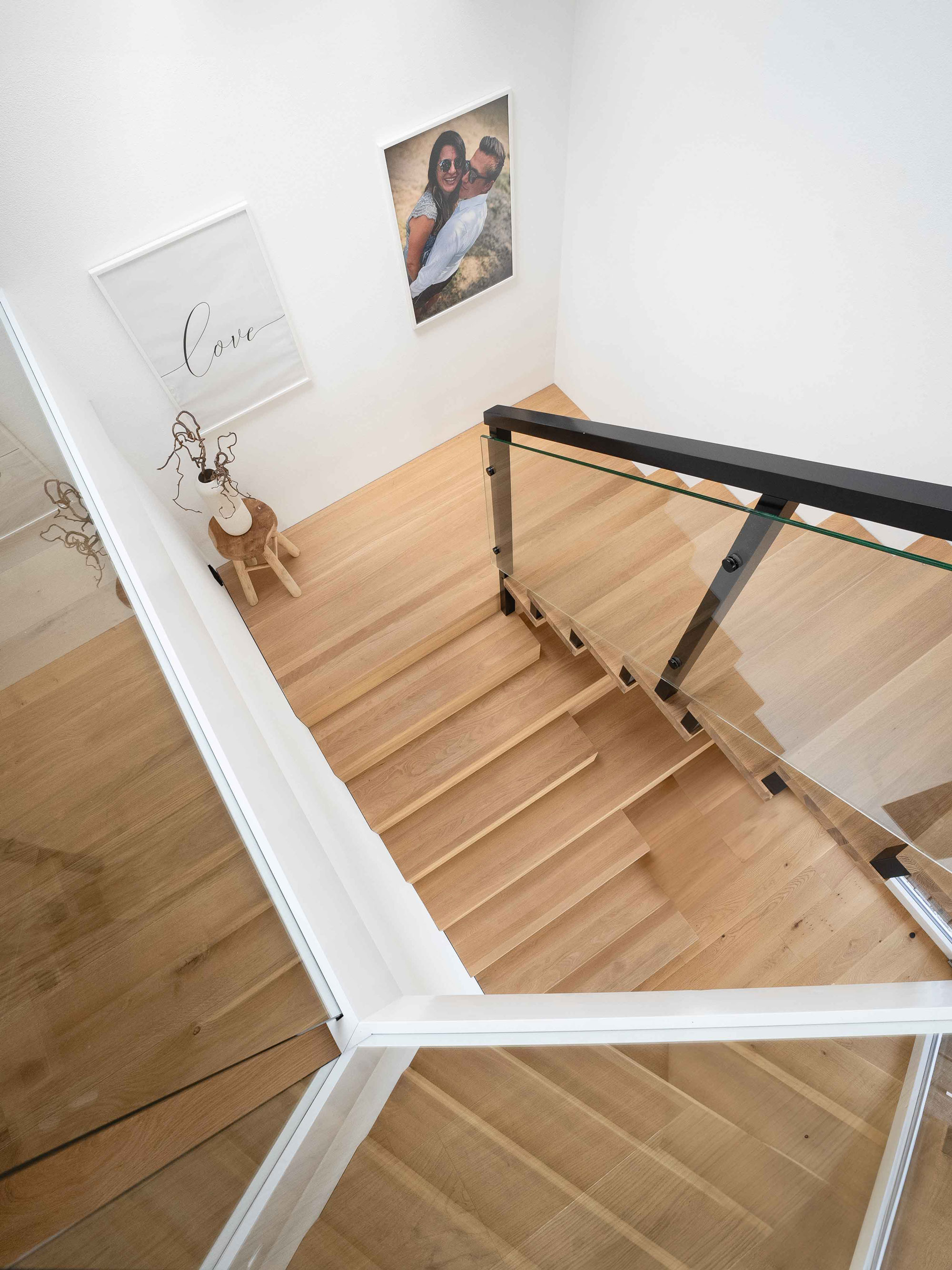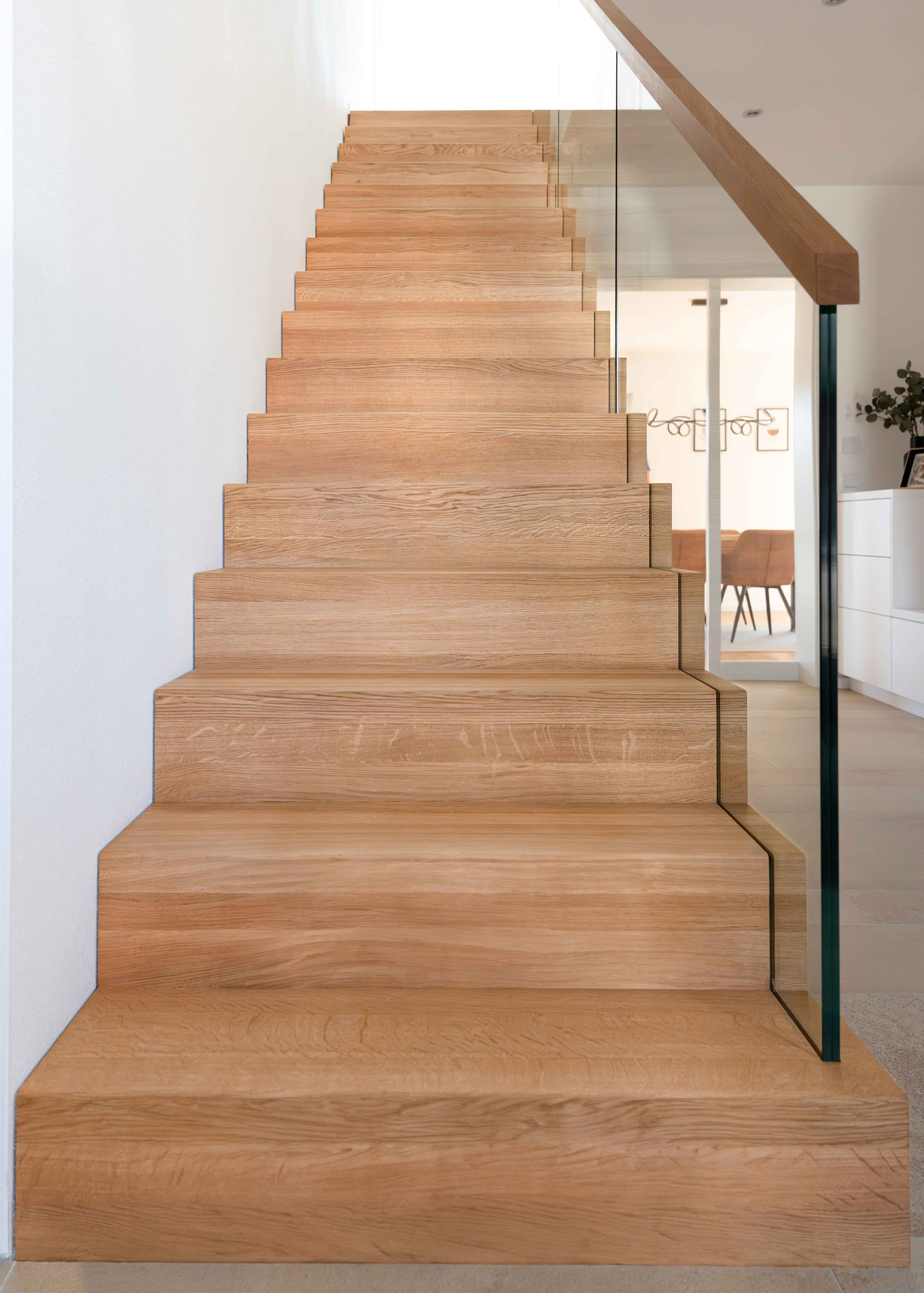 Ob aus warmem Massivholz oder kombiniert mit Glas und Stahl – jede Treppe wird individuell gefertigt und fügt sich harmonisch in Ihr Zuhause ein.
